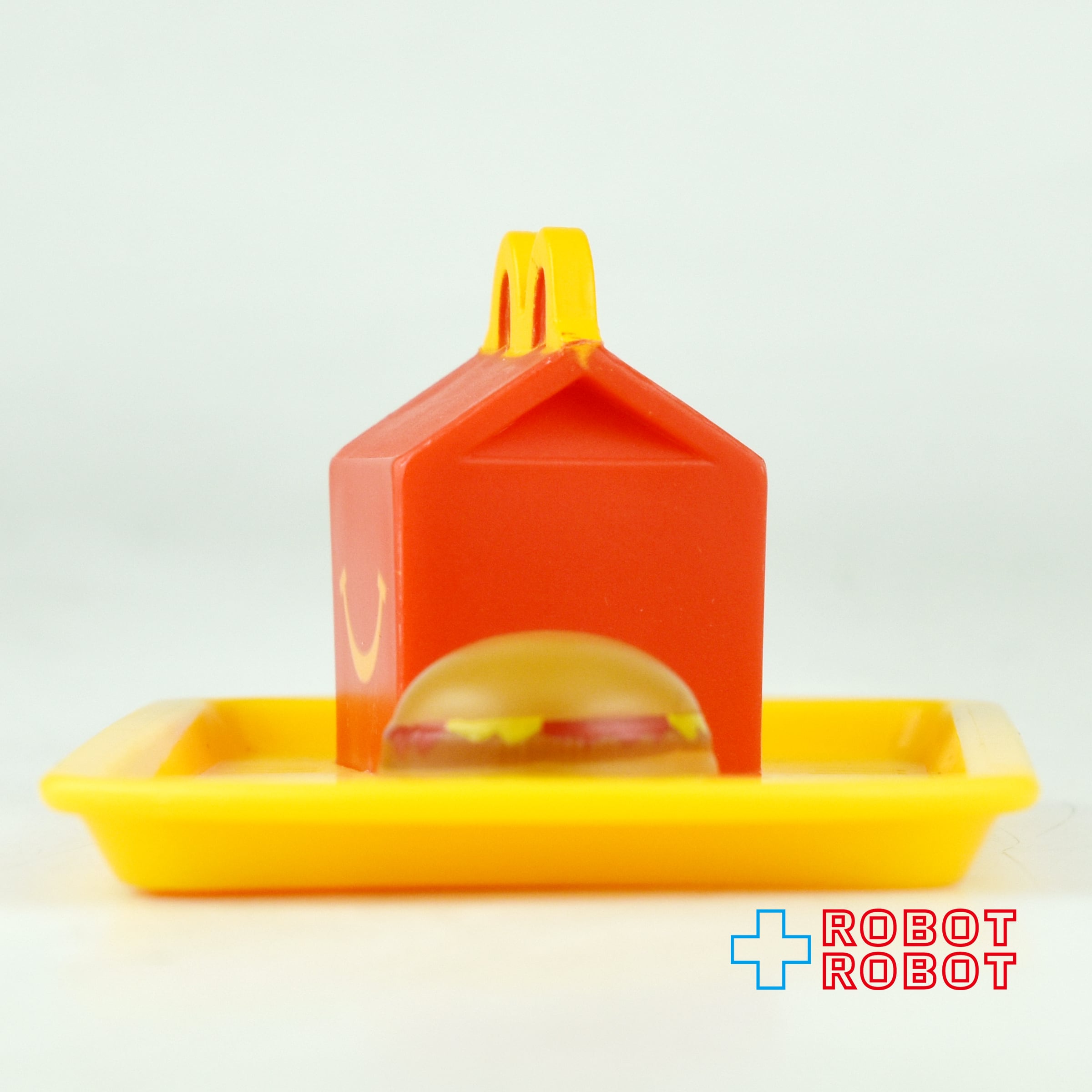 ハッピーセットボックスとハンバーガーがトレイにのったおもちゃ。